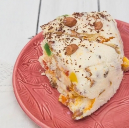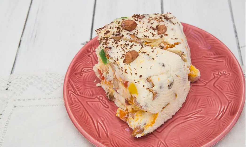 Dodamo še narezane mandlje ter narezano kandirano in suho sadje, spet premešamo, da se enakomerno porazdelijo, nato zmes prestavimo v piramidast kalup ali skledo z okroglim dnom. Dno sklede obložimo z gazo. Mora biti dovolj velika, da bomo z njo zaobjeli celo sladico. Tako ji bomo lažje odcedili odvečno vodo. Skledo dobro napolnimo z zmesjo, pokrijemo z gazo in jo obrnemo na večji krožnik.