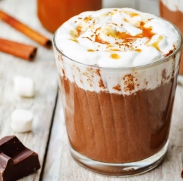 Sladki smetani dodamo malo sladkorja, jo z električno metlico stepemo in damo na vročo čokolado. Karamelo naredimo po receptu, ki ga najdete na naši strani pod zavihkom sladice in z njo prelijemo smetano. Po vrhu potresemo še malo cimeta in postrežemo.