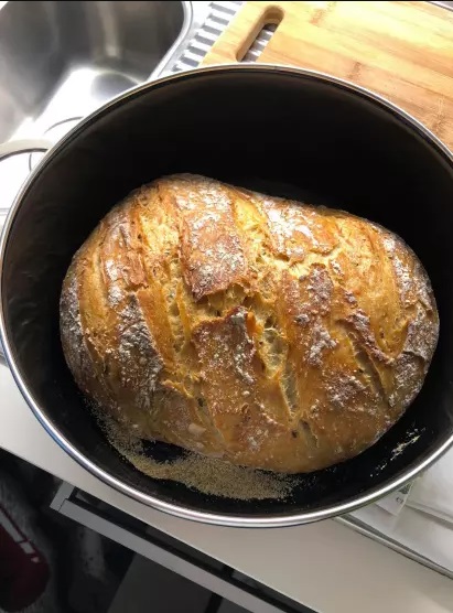 Posodo vzamemo iz pečice in pri tem pazimo, saj bosta posoda in pokrov zelo vroča. Na dno posode potrosimo polento in v posodo enostavno položimo zmes. Pečemo 30 minut v zaprti posodi na 220 °C. Nato posodo pazljivo odpremo in pečemo še 25 minut na 200 °C. Po peki bo kruh zdrknil iz posode, zato brez skrbi, ne bo se zalepil. V posodo ne polagamo peki papirja, ne potrebujemo niti maščobe.