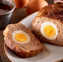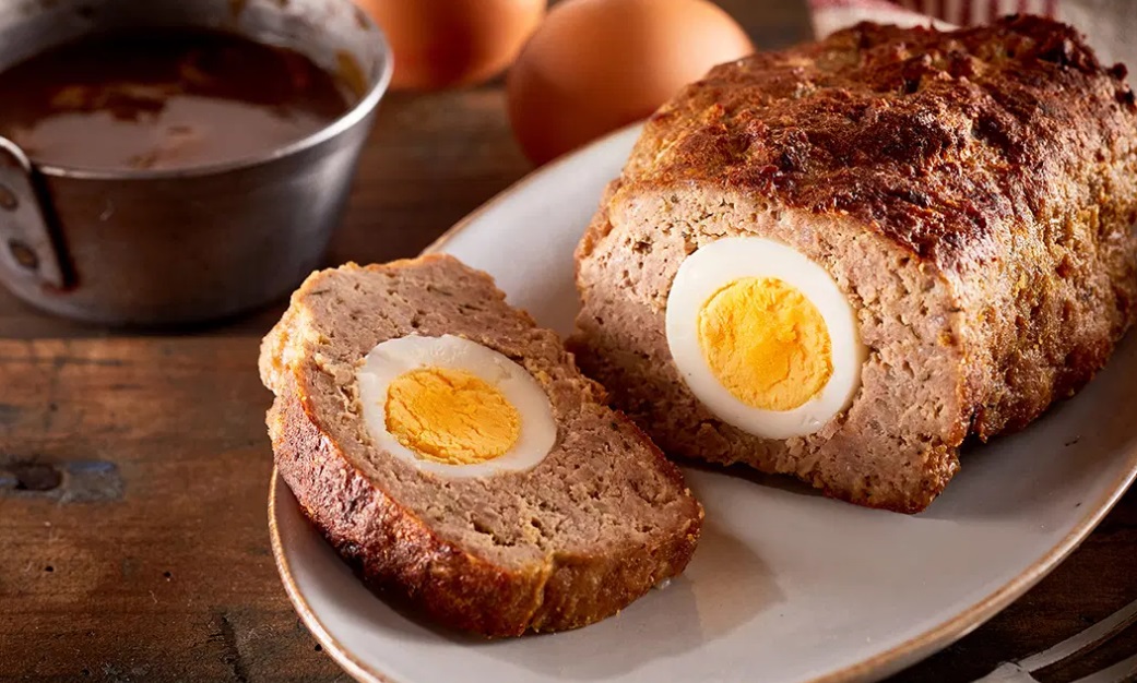 Medtem na trdo skuhamo 4 jajca, jih ohladimo v mrzli vodi in olupimo. Pečico segrejemo na 180°C. Podolgovat model namažemo z mastjo ali margarino, vanj razgrnemo polovico mesa in mu po sredini po dolgem naredimo vdolbino, v katero bomo položili jajca. Roke naj bodo med delom z mesom vlažne.