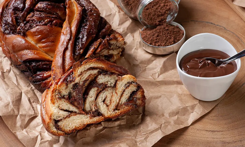 Vzhajano testo razvaljamo, premažemo z nutello. Zvitek prerežemo na polovico po dolgem, ne do konca – na vrhu ga ne prerežemo. Trakova prepletemo enega čez drugega.