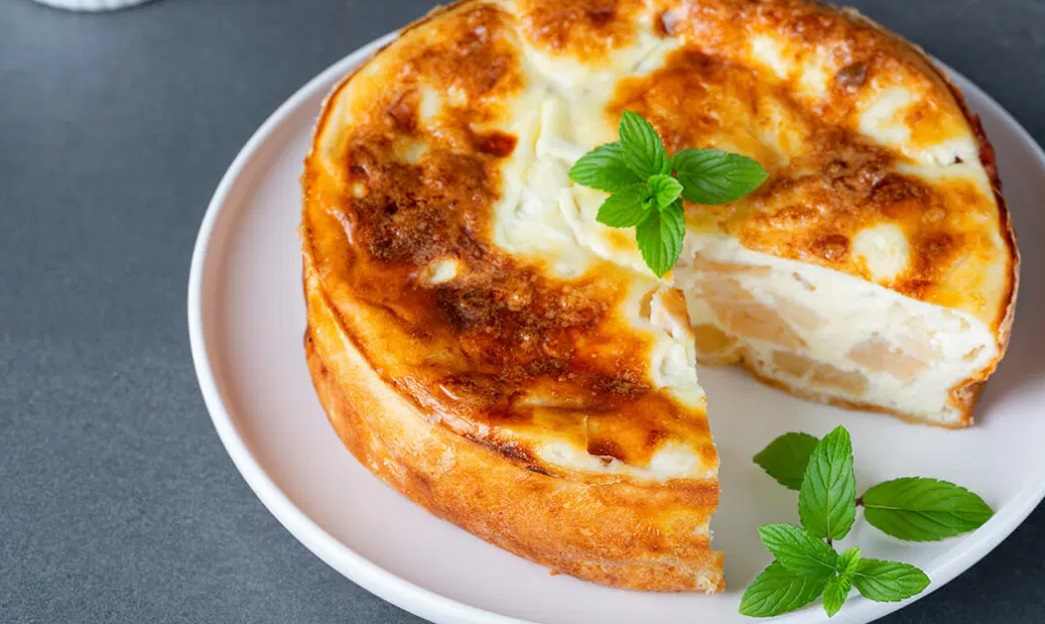 4 jabolka 500 g skute 1 kisla smetana 150 g pšeničnega zdroba 120 g sladkorja 1 vaniljev sladkor 1/2 pecilnega praška 3 jajca 1 neškropljena limona – lupinica in sok 1 žlička cimeta 1/2 žličke soli 2 žlici stopljenega masla za pekač