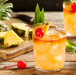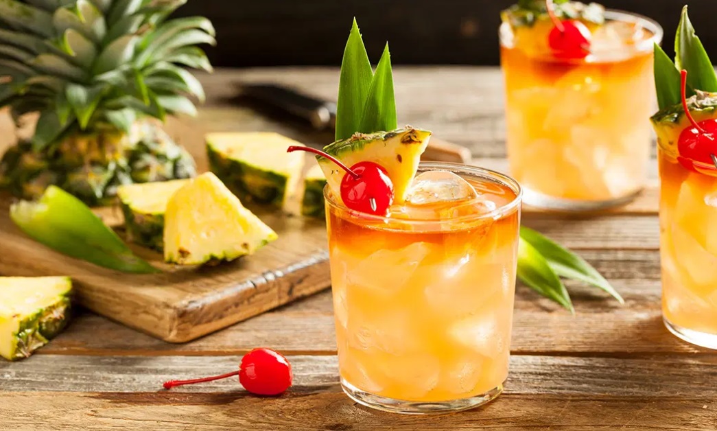 4 do 5 kock ledu 3,5 cl belega ruma 3,5 cl temnega ruma 1,5 cl likerja Orange Curacao 1,5 mandljevega sirupa 0,5 cl zgoščenega sladkornega sirupa 1,0 cl sveže iztisnjenega limoninega sirupa rezina svežega ananasa in kandirana češnja za okras