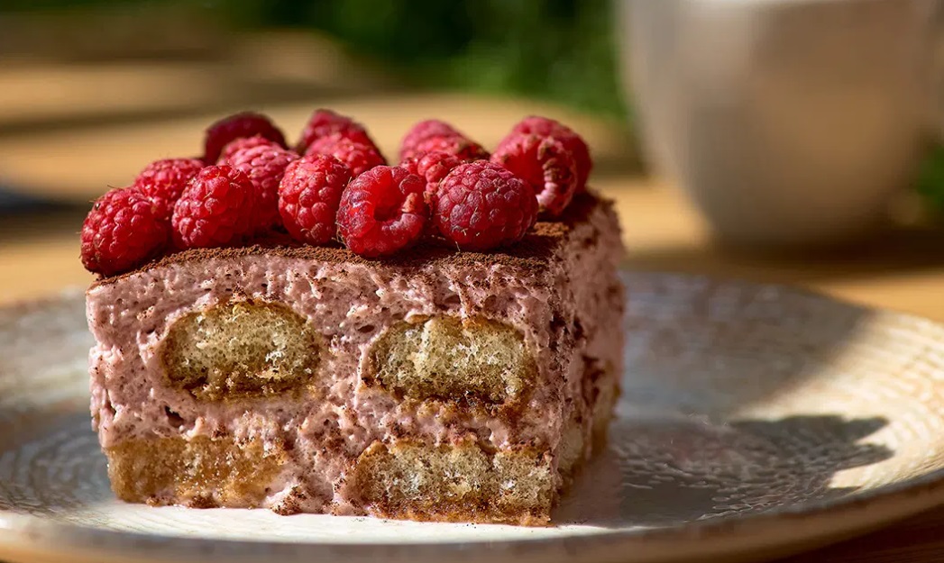 Tiramisu zaključimo s plastjo kreme in ga postavimo v hladilnik za najmanj 4 ure. Preden postrežemo, ga okrasimo svežimi malinami.