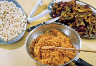 Kruhu obrežemo skorjo, ga narežemo na kocke in jih v pečici nekoliko osušimo. Slive operemo, osušimo, razpolovimo, odstranimo koščice in slivove polovice še enkrat vzdolžno prerežemo.