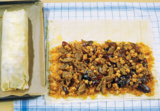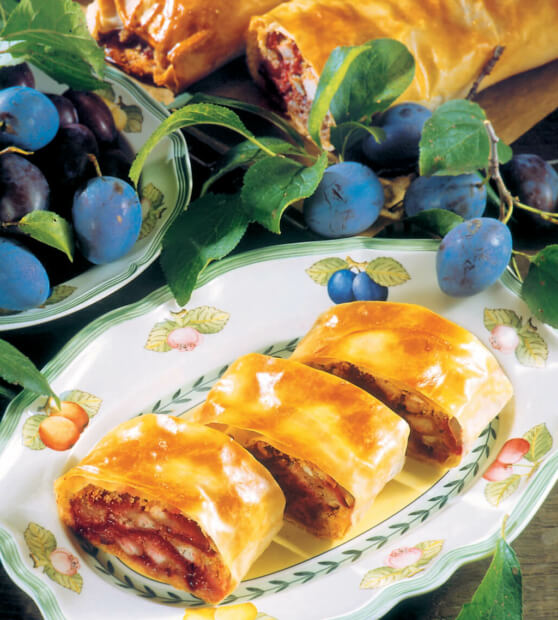 Pečico segrejemo na 180 °C. Slive zmešamo s sladkorjem, orehi, cimetom, slivovim žganjem in krušnimi kockami. En list testa položimo na vlažno kuhinjsko krpo. Testo premažemo z razpuščenim maslom, pokrijemo z drugim listom in tudi tega premažemo z maslom. Dve tretjini testa posujemo s polovico maslenih drobtin, nato po drobtinah razporedimo polovico slivovega nadeva. Zavitek zvijemo s pomočjo kuhinjske krpe in ga položimo na pekač, obložen s papirjem za peko. Postopek ponovimo še za drugi zavitek. Oba zavitka premažemo z razžvrkljanim jajcem in pečemo približno 35 minut.