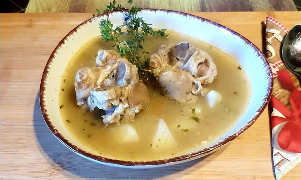 1 kg svinjskih nogic (ali svinjski uhlji, pleče ali vrat) jušna zelen (korenček, peteršilj, zelena, čebula) poper v zrnu sol timijan majaron
