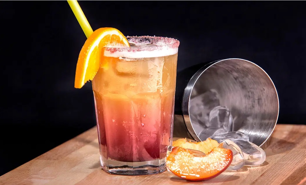 4-5 kock ledu 4,5 cl vodke 2,5 cl breskovega brandyja 4,5 cl sveže iztisnjenega pomarančnega soka 4,5 cl malinovega soka rezina pomaranče za okras