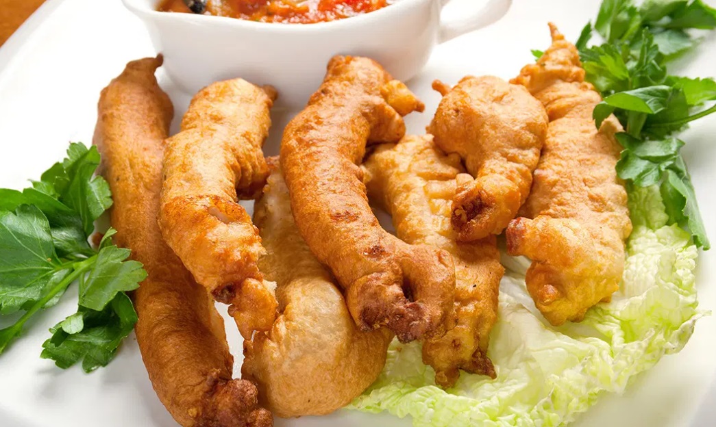 Iz jajc, piva in moke naredimo gosto testo kot za palačinke. Vode ne uporabljajmo, samo pivo! Testo mora biti tako gosto, da ne kaplja, vendar je še vedno tekoče. Posolimo testo po okusu in ga pustimo, da počiva 15 min.