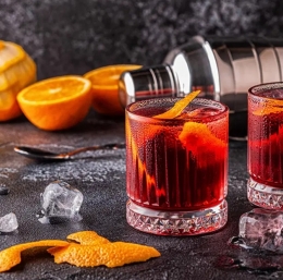 0,3 dl Camparija 0,3 dl rdečega vermuta 0,3 dl gina lupinica ene neškropljene pomaranče ledene kocke