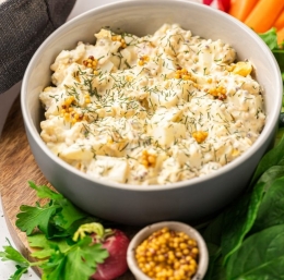 Operemo in na drobne kolobarje narežemo mlado čebulo, ki jo dodamo jajcem skupaj z gorčičnimi semeni, grškim jogurtom, česnom v prahu, koprom, soljo in poprom.