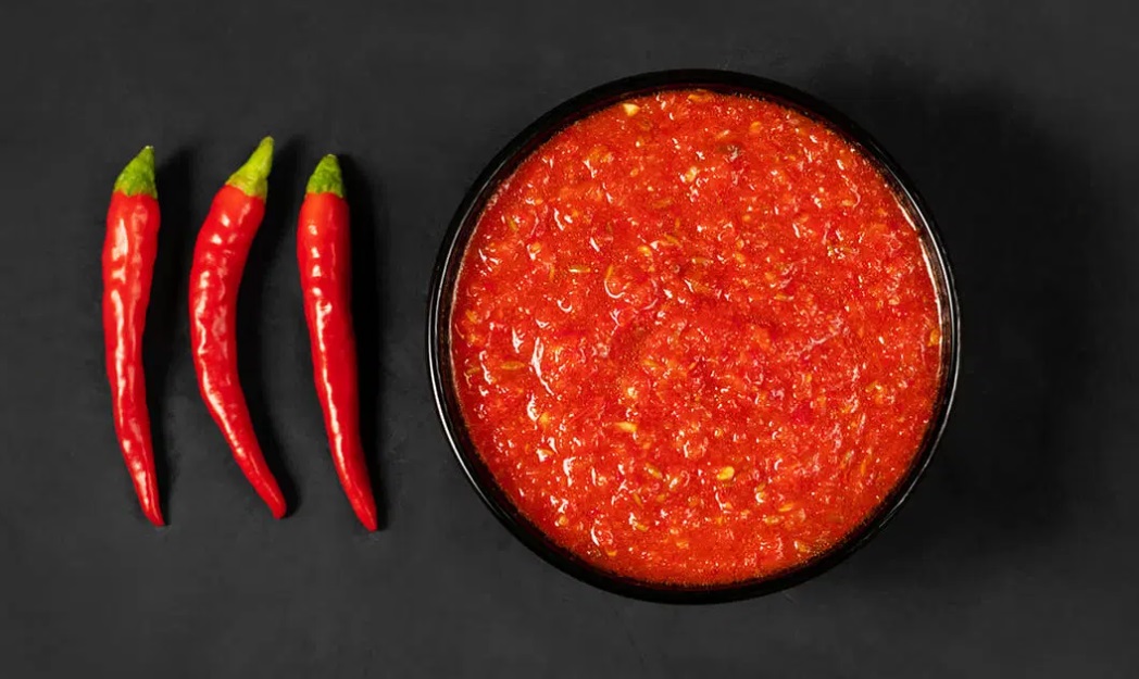 5 rdečih čilijev (lahko prilagodite glede na stopnjo začinjenosti) 3 stroke česna, nasekljan 1 velika paradižnik, nasekljan 1/2 čebule, nasekljane 1/2 skodelice kisa (npr. beli vinski kis ali jabolčni kis) 1/2 skodelice vode 1 žlička soli (ali po okusu) 1 žlička sladkorja (po želji, za uravnoteženje kislosti) 1 žlica olivnega olja