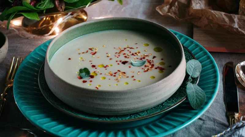 Juho zmeljemo s paličnim mešalnikom in postrežemo z ocvrtimi žajbljevimi listi in čilijevimi kosmiči.