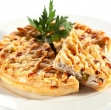 Vlijte pripravljen nadev v testo in ga enakomerno porazdelite. Prekrijte nadev s preostalim testom ali ga izrežite v trakove in ustvarite mrežast vzorec na vrhu.