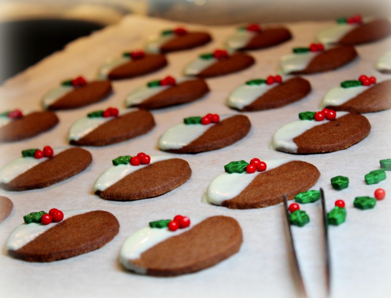 S pomočjo pincete nanesemo sladkorne božične okraske. Okraske nanesemo na mesto kjer je obliv čokolade, tako se bodo okrasi na piškotu zlepili in na njem tudi ostali.