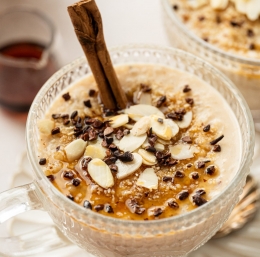 Sestavine 1 l ovsenega napitka OPlant 120 g arborio riža 1 cimetova palčka ¼ čajne žličke ingverja ščep soli 2 jedilni žlici kremnega sira (uporabite lahko tudi veganski nadomestek) 1 čajna žlička vaniljeve arome 1-2 jedilni žlici rjavega sladkorja (več po okusu) 4 jedilne žlice mletih lešnikov