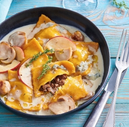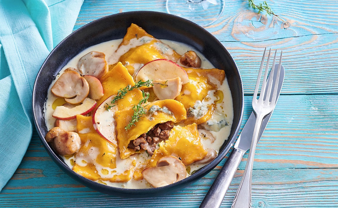 Bučni ravioli z jabolki in jurčki bodo razveselili celo družino kot tudi zahtevnejše obiske.