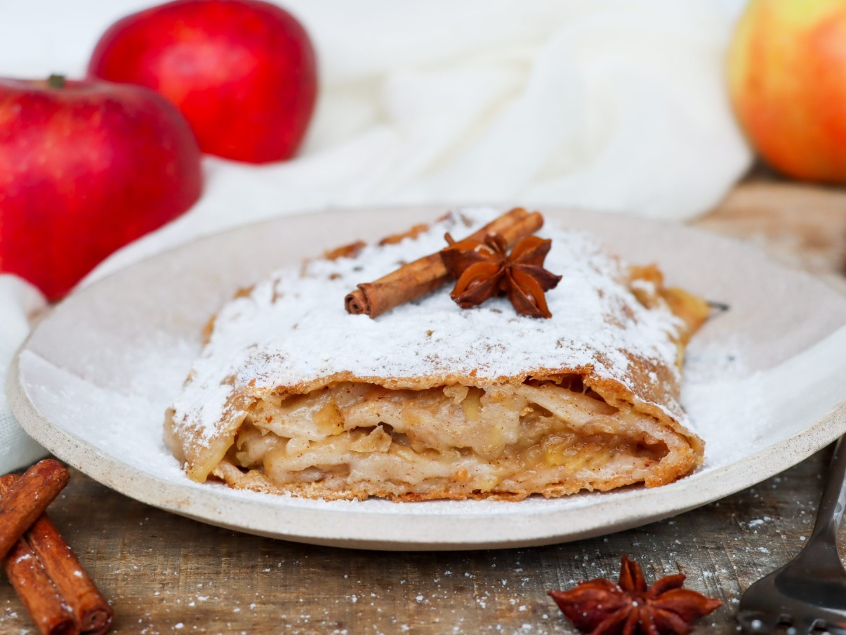 Štrudelj ne vsebuje sladkorja, saj so že jabolka zelo sladka in ni potrebe po dodajanju dodatnega sladkorja, prav tako pa ne vsebuje olja. Tudi brez njega se testo enako dobro razvleče in lepo zapeče, štrudelj pa lahkko uživamo popolnoma brez slabe vesti! Ko je zavitek pečen, ga lahko posujete z eritritolom ali sladkorjem v prahu.