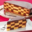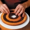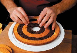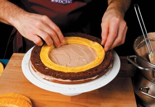 Obložimo s ploščo, ki jo sestavimo iz 3 temnih obročev in 2 svetlih (začnemo s temnim obročem). S četrtino nadeva premažemo tudi to in enako naredimo s preostalimi krogi. Torto postavimo za eno uro na hladno, prelijemo jo s temnim čokoladnim oblivom in spet postavimo na hladno.