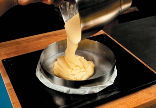 Tortni obroč postavimo na večji kos papirja za peko, ki ga zavihamo ob obroču tako, da s papirjem oblikujemo dno modela. Postavimo ga na pekač. Obroč napolnimo s svetlo biskvitno maso, jo poravnamo in pečemo v vnaprej segreti pečici na 180 °C približno 30 do 35 minut.