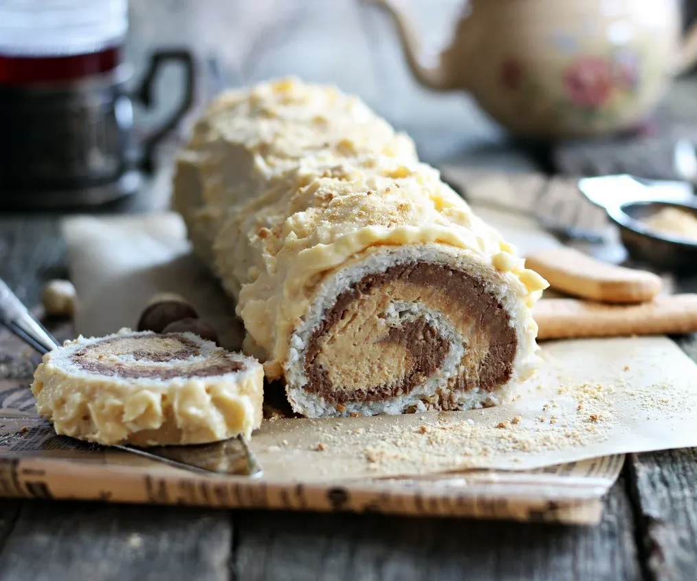 Nežen biskvit iz beljakov in kokosove moke ovije dvobarvno kremo, v kateri so čokolada, lešniki in piškoti.