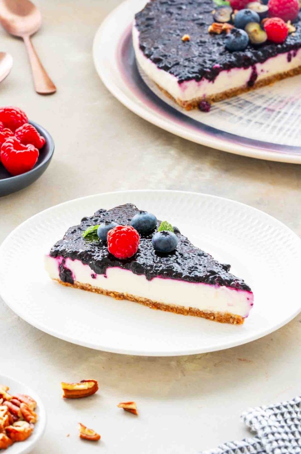 Kvark pita z borovnicami in chia semeni je osvežujoča, lahka sladica, ki združuje kremasto teksturo vanilijevega kvarka in grškega jogurta s hrustljavo osnovo iz ovsenih kosmičev, pekanov in datljev. Preliv iz borovnic in chia semen doda osvežilno sadno noto, ki se popolnoma ujema s kremnim nadevom.
