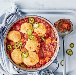 Testo oblikujemo v 8 kroglic. Položimo jih na vrh enolončnice in odkrito kozico postavimo v pečico za 15 do 20 minut ali toliko časa, da cmoki narastejo in se rahlo zlato rjavo obarvajo. Enolončnico po želji posujemo s čilijem jalapeño, narezanim na tanke kolobarčke, in postrežemo.