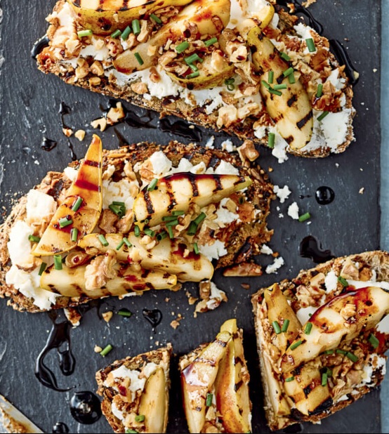 Medtem opečemo rezine kruha. Namažemo jih s kozjim sirom, obložimo z lepljivimi hruškami ter posujemo z drobnjakom in orehi. Pokapamo z balzamičnim kisom in postrežemo s solato.