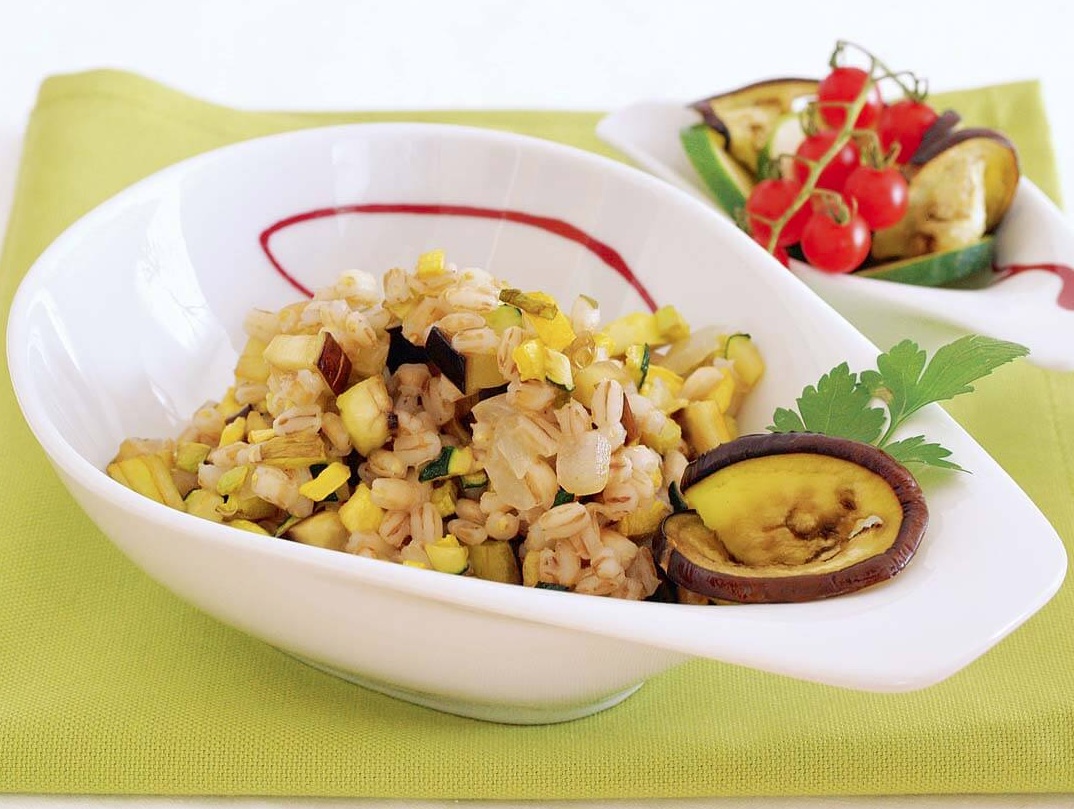 Kockice bučk in jajčevcev spečemo v ponvi na 2 žlicah oljčnega olja, da so še čvrste, ter dodamo k ješprenju in zmešamo. Paradižnikovo mezgo zamešamo s kančkom vode in vmešamo v ješprenj. Dodamo parmezan, previdno premešamo, po okusu začinimo in jed pred serviranjem potresemo s sesekljanim peteršiljem.