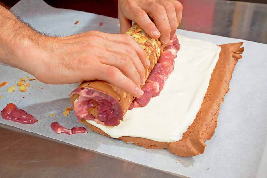 Biskvitno maso enakomerno namažemo na pekač, ki smo ga obložili s papirjem za peko; potresemo z mandljevimi lističi in pečemo v prej ogreti pečici pri 200 °C 10 do 20 minut. Pečen biskvit pokrijemo s papirjem za peko, zvrnemo na delovno površino in odstranimo papir, na katerem se je biskvit pekel. Biskvit zvijemo skupaj s svežim papirjem in pustimo, da se ohladi.