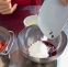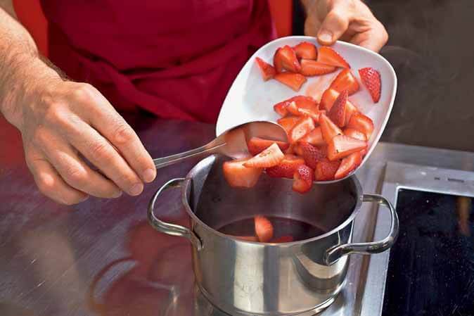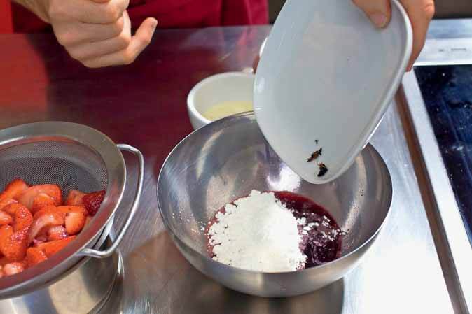 Medtem pripravimo nadev. Jagode operemo, očistimo ter razpolovimo ali razrežemo na četrtine. V kozici karameliziramo kristalni sladkor, ga zalijemo z vinom in kuhljamo toliko časa, da se raztopi. Dodamo narezane jagode, rahlo zmešamo in pustimo stati približno 5 minut. Nato jagode stresemo na cedilo. Sok prestrežemo, mu dodamo jedilni škrob, vaniljevo sredico in belo čokolado; gladko zmešamo in hitro zavremo. Ponovno dodamo jagode, zmešamo in nadev ohladimo. Nazadnje pripravimo še kremo. Želatino namočimo v malo hladne vode. Sladko smetano rahlo stepemo. V kozico stresemo vaniljev sladkor. Dodamo neožeto želatino ter oboje med mešanjem segrevamo na blagem ognju, da se želatina raztopi. Kozico odstavimo, dodamo 2 do 3 žlice rahlo stepene smetane, zmešamo, potem pa vmešamo v preostalo smetano. Kremo postavimo na hladno.