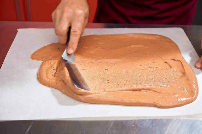 Rumenjake ločimo od beljakov in jih penasto stepemo s ščepcem soli in 60 g kristalnega sladkorja. Beljake stepemo z malo soli in preostalim sladkorjem v čvrst sneg in ga damo na rumenjakovo maso. Moko pomešamo s kakavom, presejemo na maso in rahlo zmešamo.