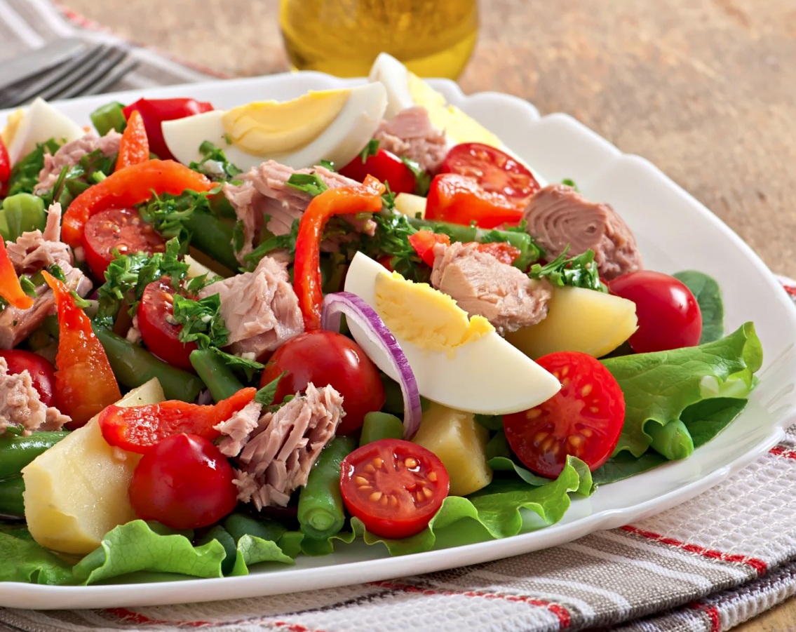 200 g svežega listnatega solatnega mixa (npr. zelena solata, rukola, špinača). 2 srednje velika krompirja, kuhana in narezana na kocke. 4 kuhana jajca, narezana na četrtine. 150 g češnjevih paradižnikov, razpolovljenih. 100 g kuhanega stročjega fižola. 1 rdeča paprika, narezana na trakove. 1/2 rdeče čebule, narezane na tanke kolobarje. 150 g konzervirane tunine v oljčnem olju (odcejene). Svež peteršilj za okrasitev.