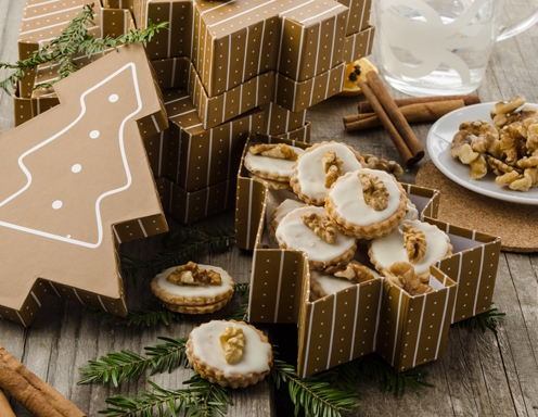 Čokoladne piškote z orehi lahko premažemo tudi s čokoladno glazuro ali glazuro z nugatom.