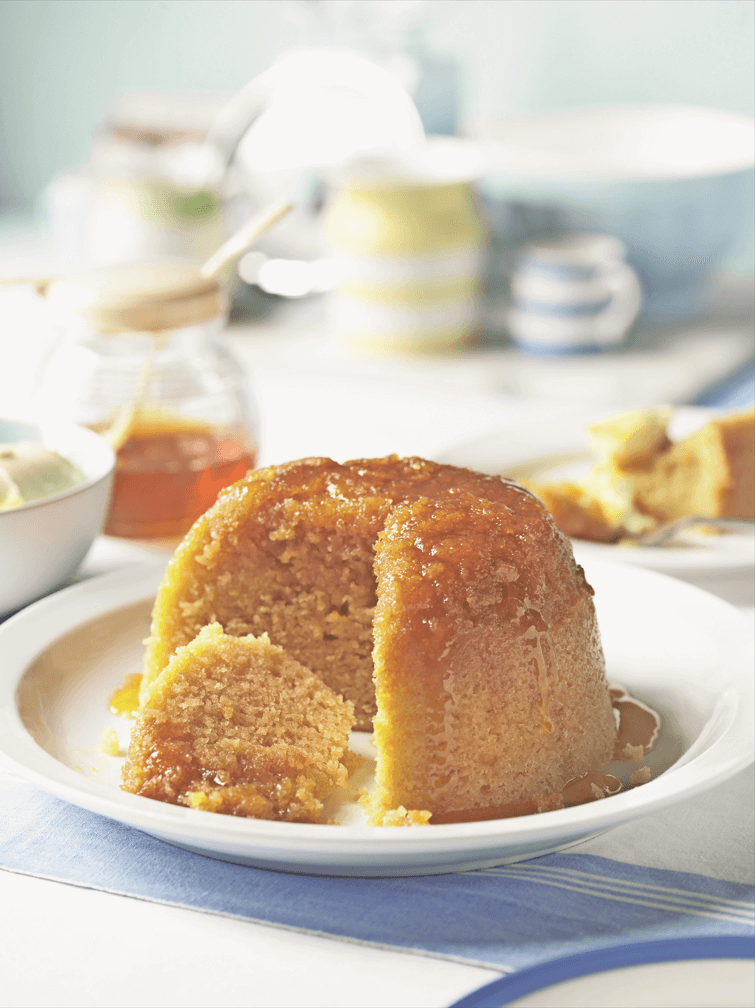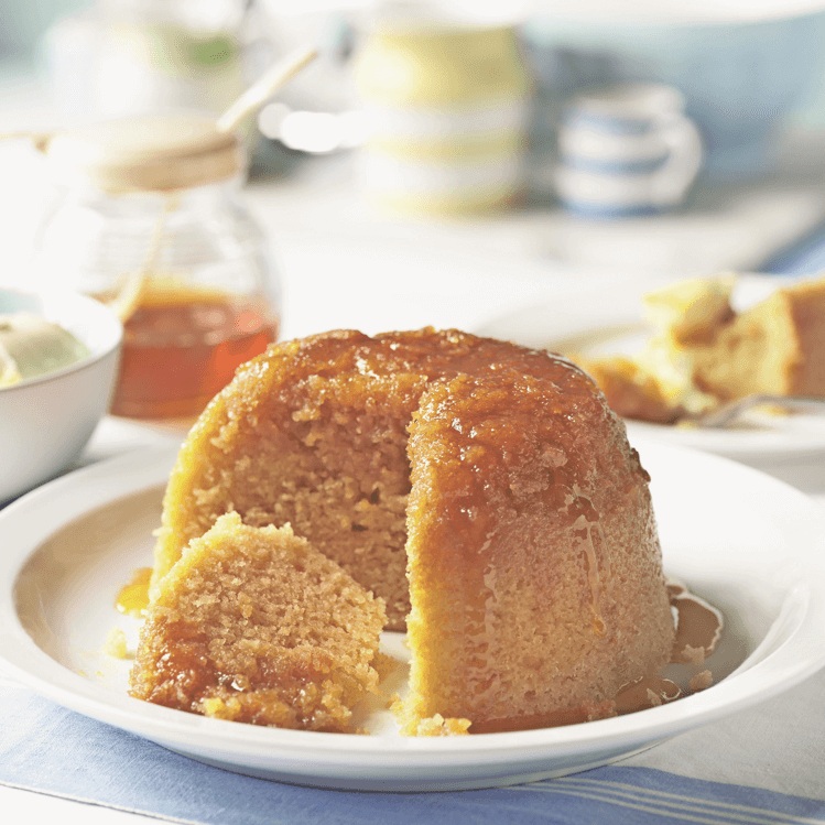 175 g zmehčanega masla ter še malo za model in folijo 3 žlice tekočega medu in po želji še malo za pokapanje 1 žlica svežih belih krušnih drobtin malo vinjaka (po želji, ampak priporočamo) 175 g svetlo rjavega kristalnega sladkorja naribana lupinica 1 bio limone 3 velika jajca 175 pšenične bele moke 1⁄2 zavitka pecilnega praška 2 žlici mleka topljena smetana, ko postrežemo (nasvet spodaj)