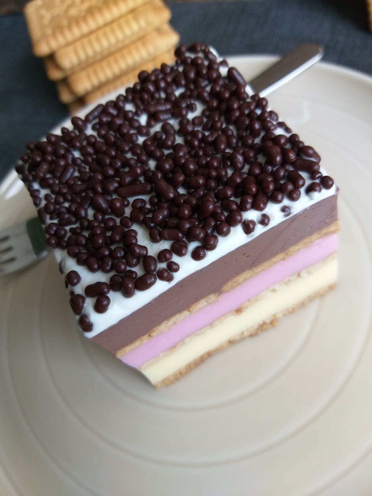 Kocke so po vrhu premazane še s stepeno sladko smetano in posute s čokoladnimi mrvicami. Za originalen okus vam priporočam Kraševe čokoladne mrvice, ki so oblite s čokolado in neprimerljivo boljše od ostalih.