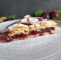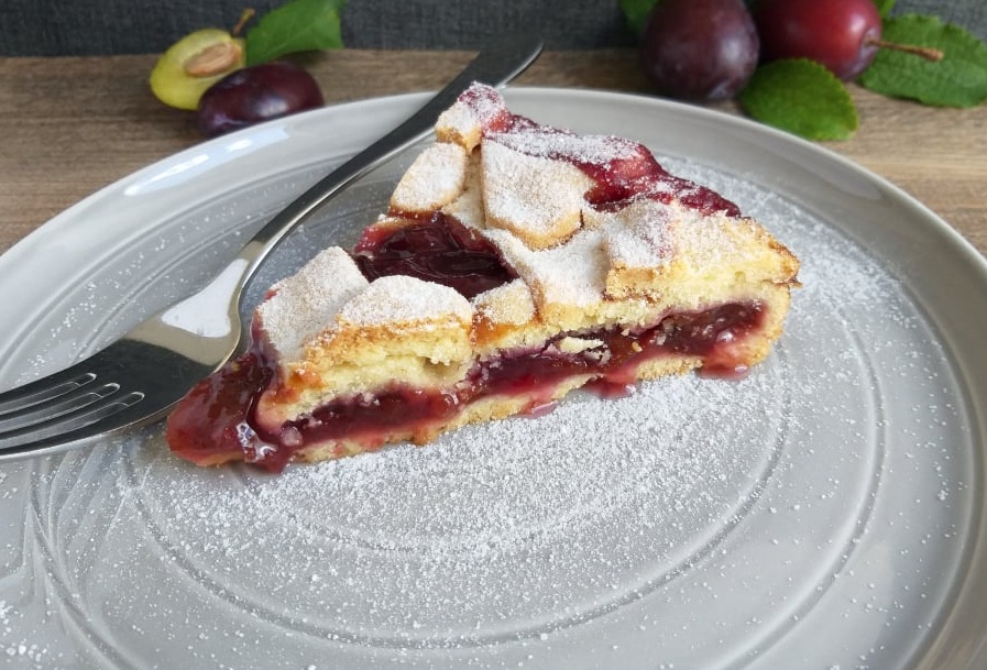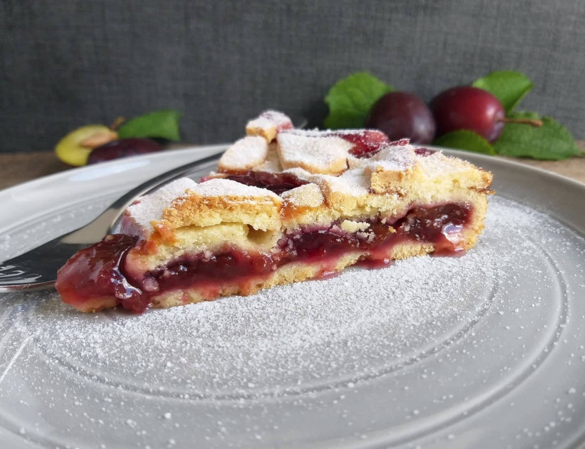 Spodaj in zgoraj je krhko piškotno testo. V njem pa se skriva preplet okusov sliv, rdečega vina in medu.
