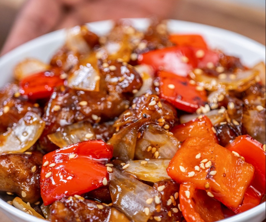 – slabih 250 g govedine na osebo, narezane na manjše kose (priporočamo flank steak) – 1 srednjo veliko belo čebulo, sesekljano – 1 rdečo papriko, narezano na manjše kvadratke – 4 velike žlice koruznega škroba – 3 žlice avokadovega (ali drugega) olja