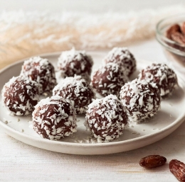 10–12 mehkih datljev, brez koščic 1 skodelica grobe kokosove moke + nekaj žlic za povaljanje 3 žlice kakava v prahu 3 žlice bučnih semen 2 žlici vode (po potrebi dodamo več) Dodatki za izboljšavo okusa (neobvezno): ščepec cimeta, ščepec soli, žlička instant kave