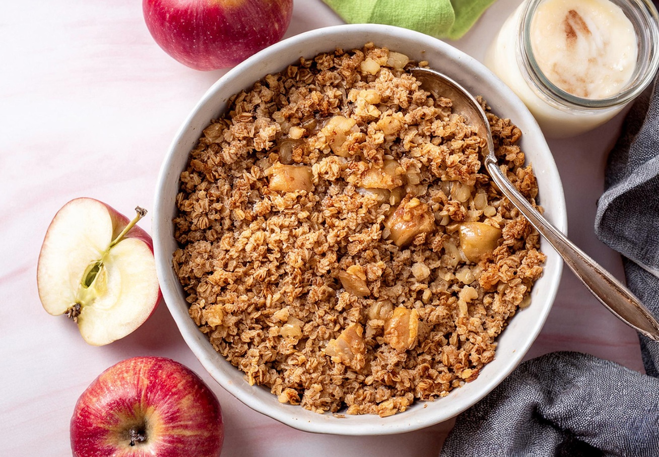 Drobljenec z jabolki, bananami in ovsenimi kosmiči je preprost in hranljiv obrok z naravno sladkobo sadja, prijetno aromo cimeta in osvežilno noto limone. Idealen je tako za zdrav zajtrk kot lahkotno sladico.