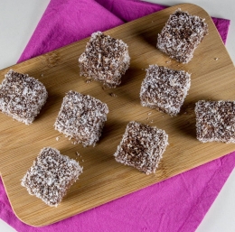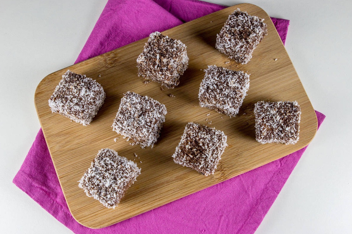 Recept za puhaste biskvitne kocke, oblite s čokolado in kokosovo moko.
