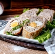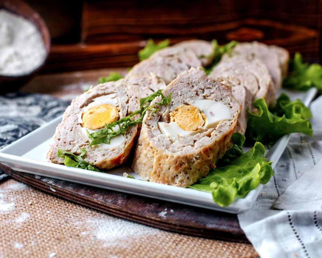1 kg mletega mešanega mesa (govedina in svinjina). 1 čebula, drobno sesekljana (lahko popečena). 2 stroka česna, strta. 2 žemlji ali 2 rezini starega kruha. 1 dl mleka. 2 jajci. 1 žlica gorčice. 1 žlica drobtin (po potrebi). Ščep soli in popra. Ščep muškatnega oreščka. Svež peteršilj, drobno nasekljan. 4 trdo kuhana jajca. Olje za pekač.