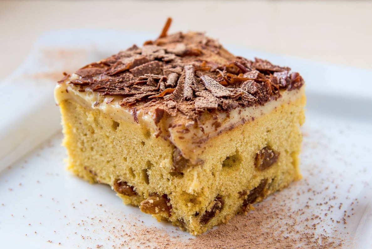 200g Rozine 5 žlic Liker - kavni 250g Maslo 150g Sladkor - beli 6 kosov Jajce - kokošje Sol 275g Pšenična bela moka Pecilni prašek 400ml Kravje mleko - manj mastno 100ml Rum Puding - v prahu Vanilijev sladkor 150g Čokolada - bela Kakav v prahu