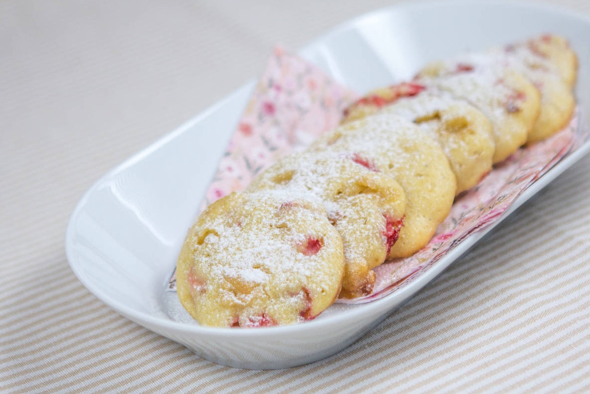150g Pšenična bela moka Pecilni prašek Sol 60g Maslo 120g Sladkor - beli 100g Sir - ricotta 1 kos Jajce - kokošje Vanilijev sladkor 140g Čokolada - bela 100g Jagode 2 žlici Svež limonin sok Sladkor - v prahu