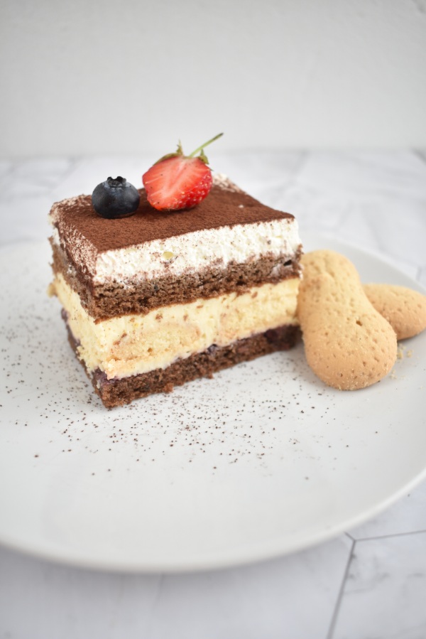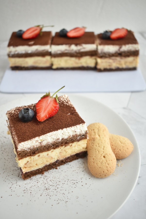 Sledi druga polovica kreme in biskvit, katerega spet namočimo z mlekom. Na vrh namažemo stepeno sladko smetano, katero smo sladkali po okusu. Sledi le še kakav za posip.