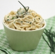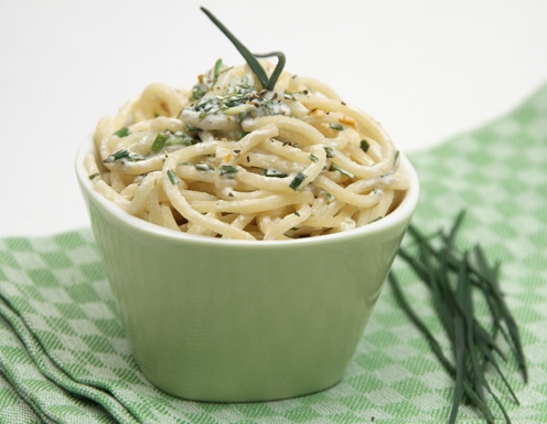 Za špagete z drobnjakom damo v vrelo slano vodo špagete in jih skuhamo al dente. Medtem v teflonski ponvi rahlo segrejemo česen, kislo smetano in preostale sestavine (ne kuhamo).