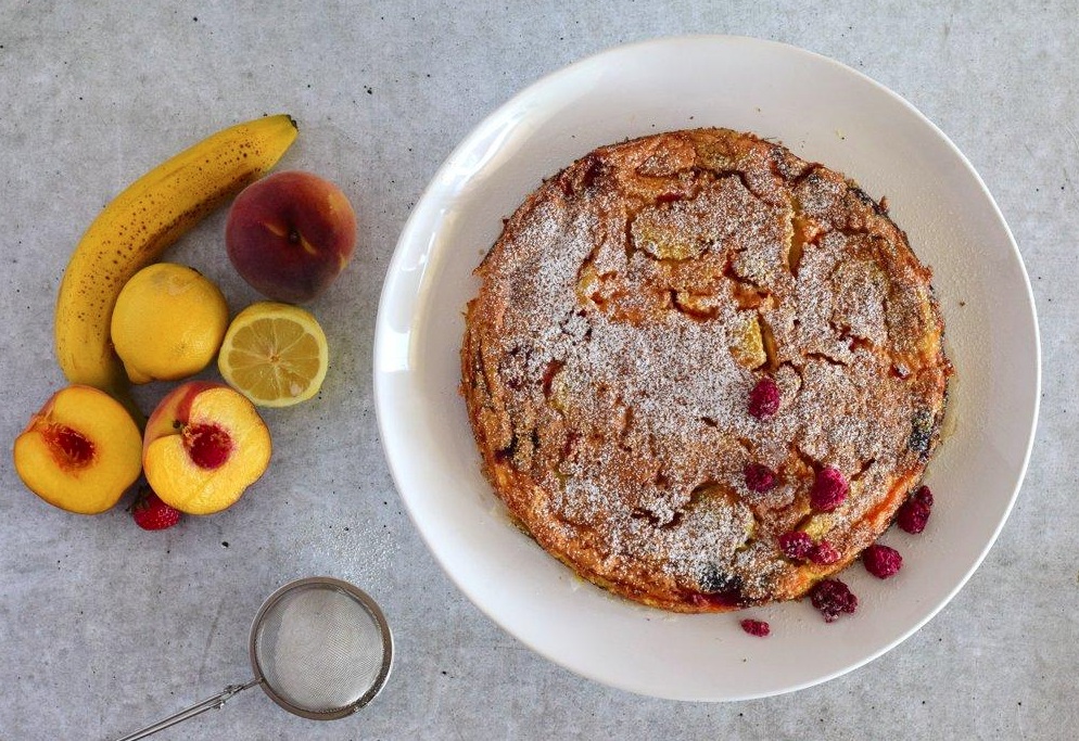 sadje po izbiri (jaz sem uporabila: 3 marelice, 1 breskev, 1 banana, nekaj gozdnih sadežev) sok in lupinica polovice limone 5 jajc 1 žlička vanilijevega ekstrakta ali vanilijeve paste, BAM 220 ml mleka 150 ml sladke smetane 175 g bele moke 125 g sladkorja