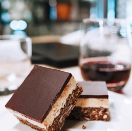 Jajci stepemo in nekaj žlic zmesi vmešamo v jajci, premešamo, da dobimo enakomerno zmes, in potem vse skupaj med nenehnim mešanjem dodamo vsebini v ponvi. Dodamo še drobtine iz temnih keksov, kokosove kosmiče in mandlje ali druge oreške. Zmes damo v pekač, jo poravnamo in damo za vsaj pol ure v hladilnik.