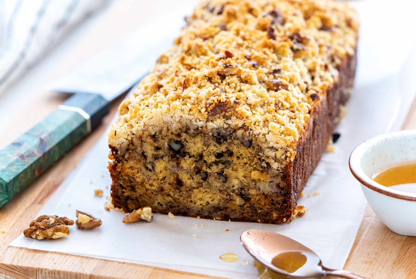 Bananin kolač z orehi je hitra rešitev, ko imamo na zalogi nekaj preveč zrelih banan. Kolač je sočen, rahel in bogatega okusa. Za hrustljavi grižljaj poskrbi slasten orehov drobljenec.