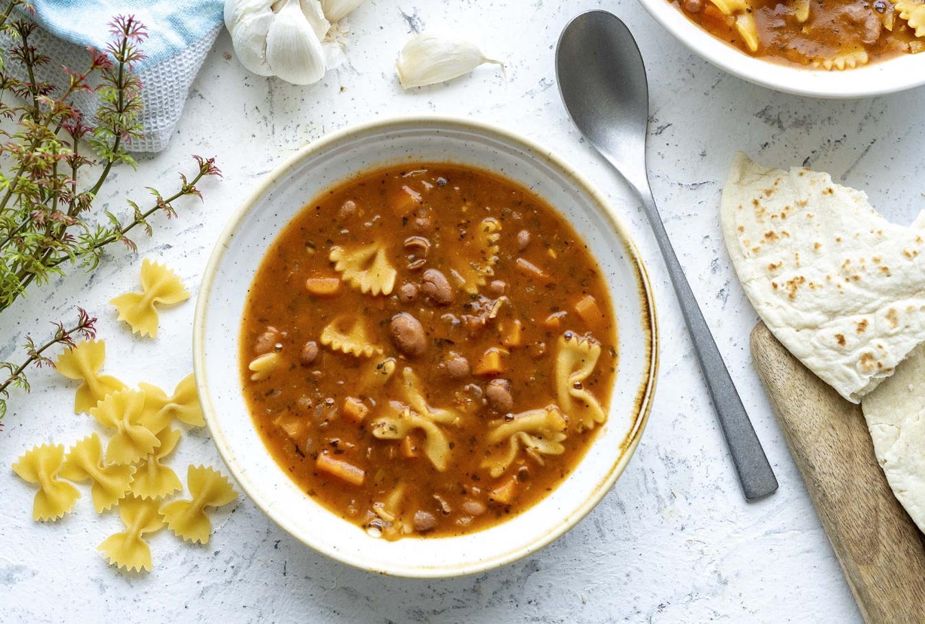 2 žlici olivnega olja 250 g čebule 1 steblo zelene 2 korenja 4 stroki česna 2 žlički mlete dimljene paprike 2 žlički mlete bazilike 1 žlička majarona 1 žlička luštreka ½ žličke mlete kumine 1 lovorjev list 2 žlici paradižnikove paste 250 g pelatov v koščkih 2 x 400 g pločevinka kuhanega fižola 1,2 l zelenjavne jušne osnove 240 g testenin 1 žlička soli (po potrebi) 1 žlička črnega mletega popra